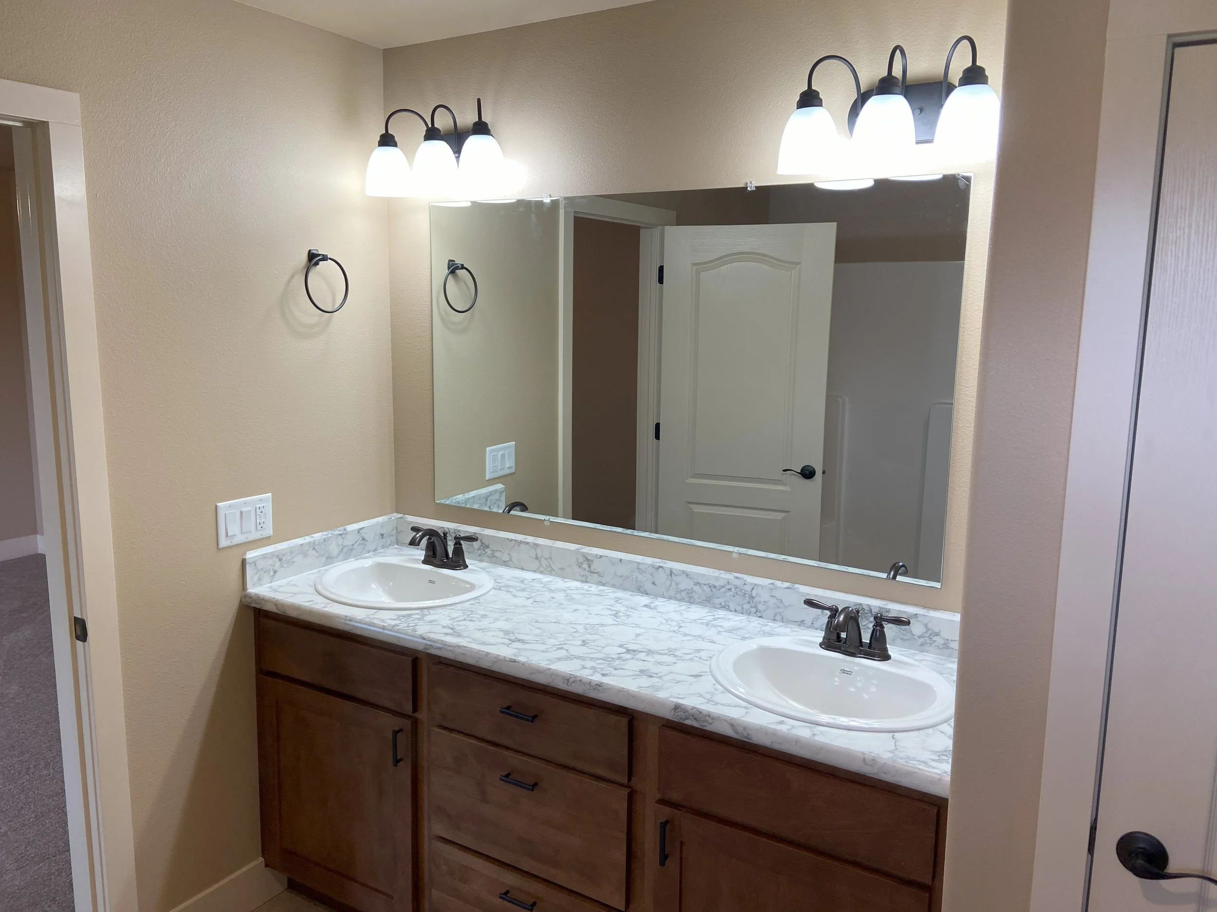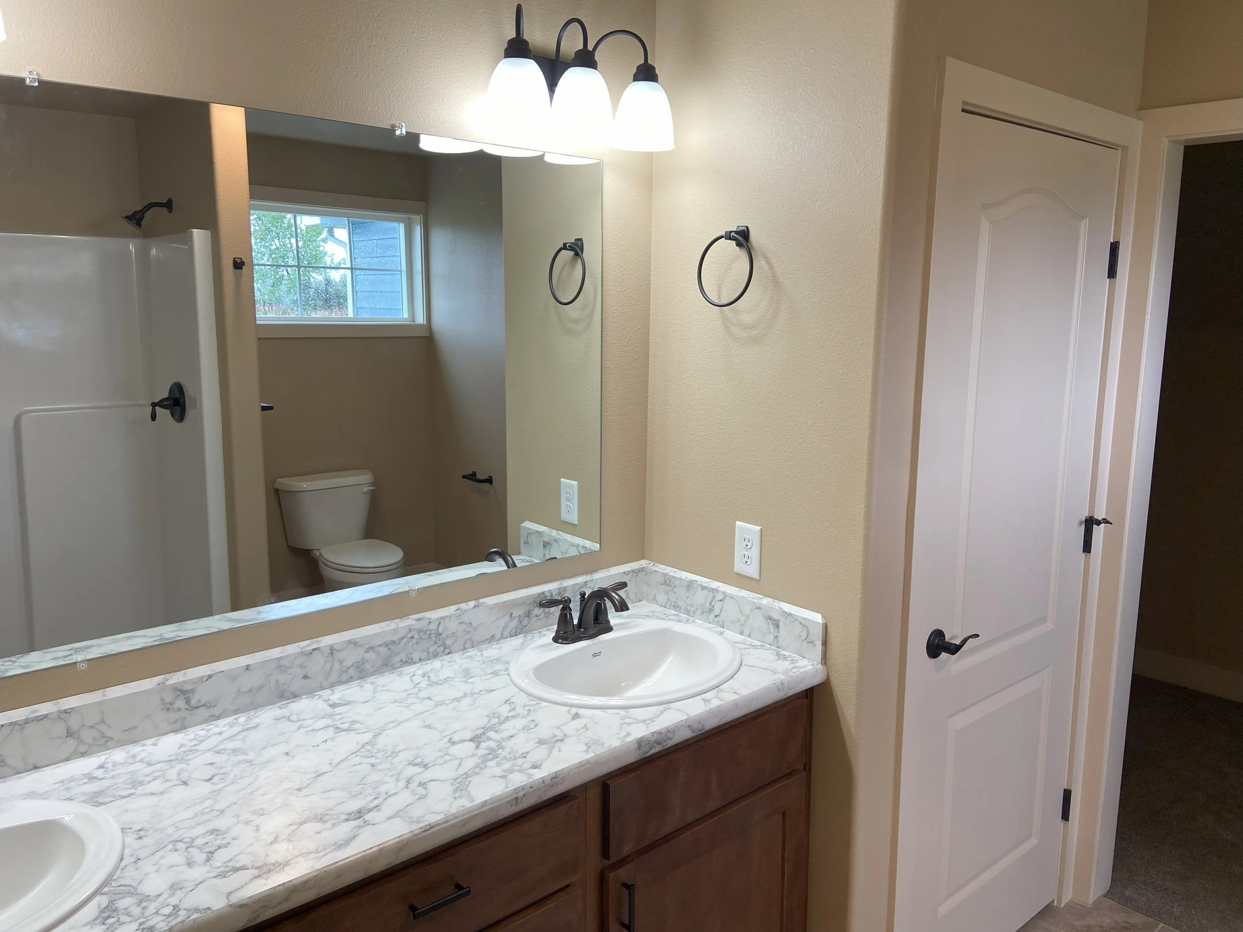 This project included a new build home in a subdivision in Montana. The house was a 4 bed 3 bath house with two living rooms, an open concept main level with a 16’x16’ deck, a master bath ensuite with adjacent walk in closet. The bathrooms seen here are the master which included a double vanity, shower, full tile floor, privacy wall between the toilet and shower, and a linen closet in the bathroom. The second bathroom is the basement bathroom complete with tile floor, fog-resistant mirror and clean color contrast vanity. Overall, the entire new build home valued at $550,000.
